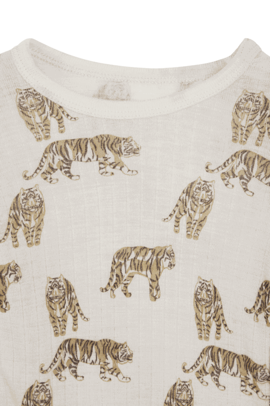 und das andere einen Tigerprint. Beide Modelle werden an der linken Schulter