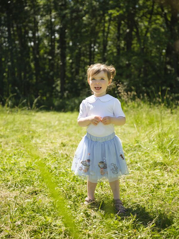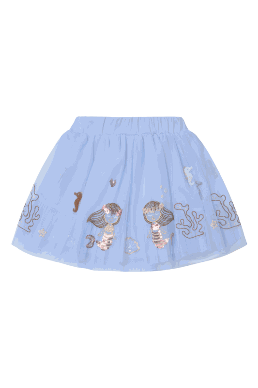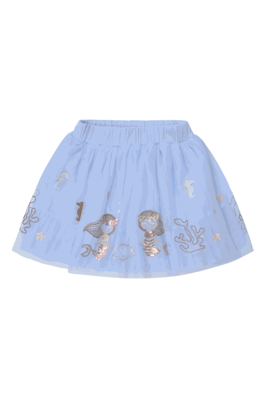 Mit diesem wunderschönen Tüllrock tauchen kleine Träumerinnen in ihre ganz eigene Unterwasserwelt ein: Feine Stickereien mit Meerjungfrauen und Korallen, veredelt mit glitzernden Pailletten, machen den Rock zu einem echten Highlight.