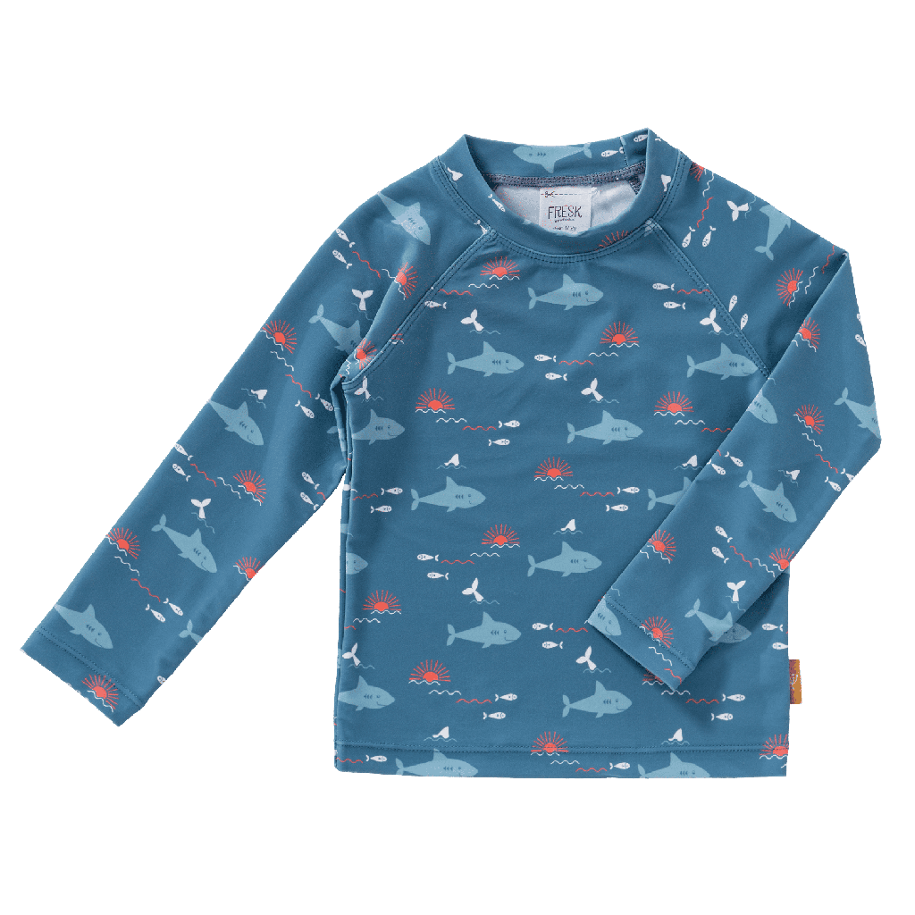 Mit seinem lebhaften Design aus kleinen Fischen, Sonnen und fröhlichen Haien wird dieses langärmelige Schwimm-T-Shirt zu einem echten Highlight jedes Strand- oder Schwimmbadbesuchs! Es schützt nicht nur vor der Sonne, sondern sorgt auch für volle Bewegungsfreiheit, damit Ihr Baby unbeschwert planschen und spielen kann.
